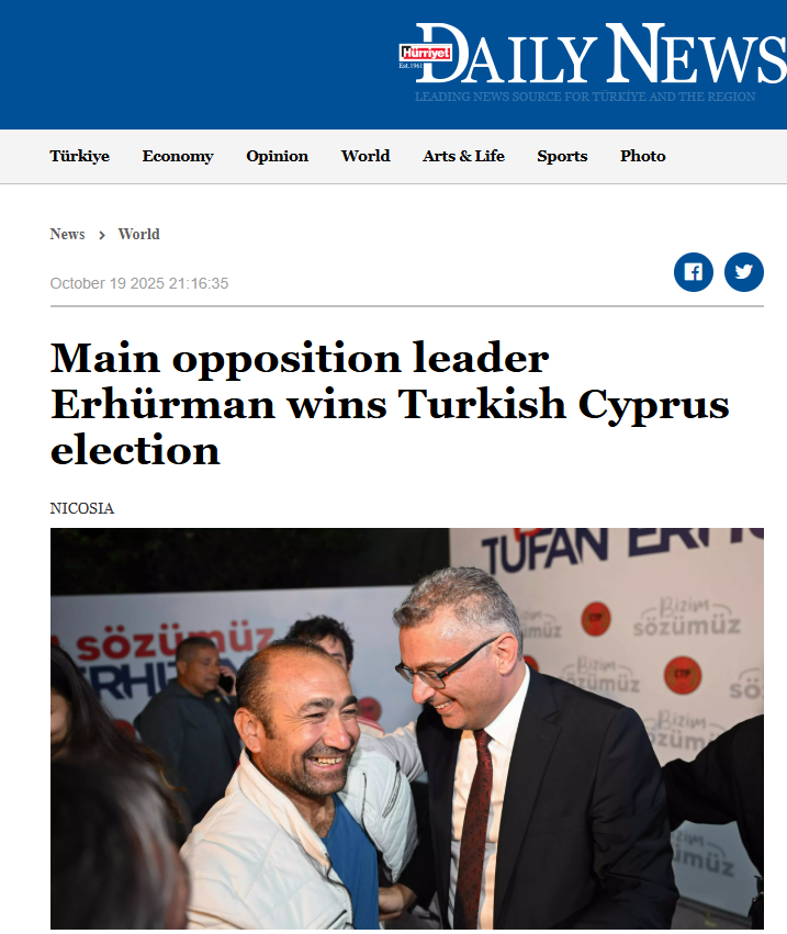 Hurriyet Daily News – «Ο ηγέτης της αξιωματικής αντιπολίτευσης Ερχουρμάν κερδίζει τις εκλογές στα Κατεχόμενα»