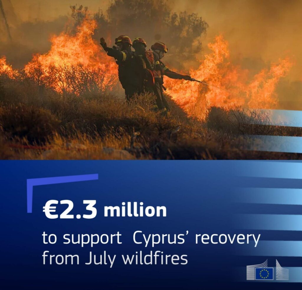 Ο Εκτελεστικός Αντιπρόεδρος της Επιτροπής για την Περιφερειακή Πολιτική, Ραφαέλε Φίττο με ανάρτησή του στο «Χ» ανακοίνωσε την απόφαση της Ευρωπαϊκής Επιτροπής να «καταβάλει προκαταβολή €2,3 εκ. από το Ευρωπαϊκό Ταμείο Αλληλεγγύης για να βοηθήσει την ανάκαμψη της Κύπρου από τις πυρκαγιές του Ιουλίου σε Λεμεσό και Πάφο». Όπως ανέφερε ο Ρ. Φίττο «η υποστήριξη καλύπτει επιχειρήσεις έκτακτης ανάγκης, υποδομές, στέγαση και αποκατάσταση».