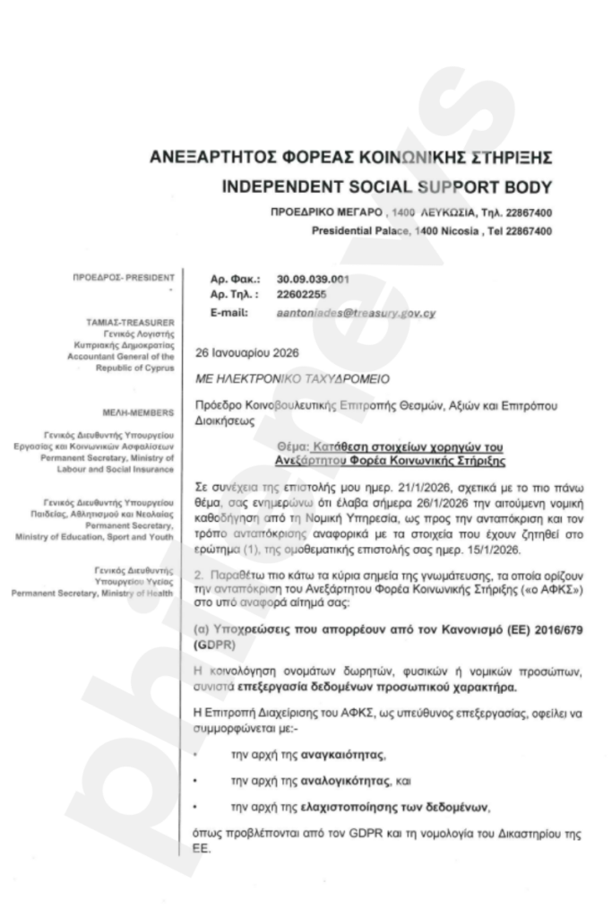 Ο Γενικός Λογιστής της Δημοκρατίας και ταμίας του Ανεξάρτητου Φορέα Κοινωνικής Στήριξης δεν θα καταθέσει τελικά στην κοινοβουλευτική Επιτροπή Θεσμών τα ονόματα των χορηγών του ταμείου καθώς και τις εισφορές στις οποίες προέβησαν από το 2020 και μετά. Για την εξέλιξη αυτή ενημέρωσε ο ίδιος με σχετική επιστολή προς τον πρόεδρο της κοινοβουλευτικής Επιτροπής Θεσμών, επικαλούμενος γνωμάτευση της Νομικής Υπηρεσίας.