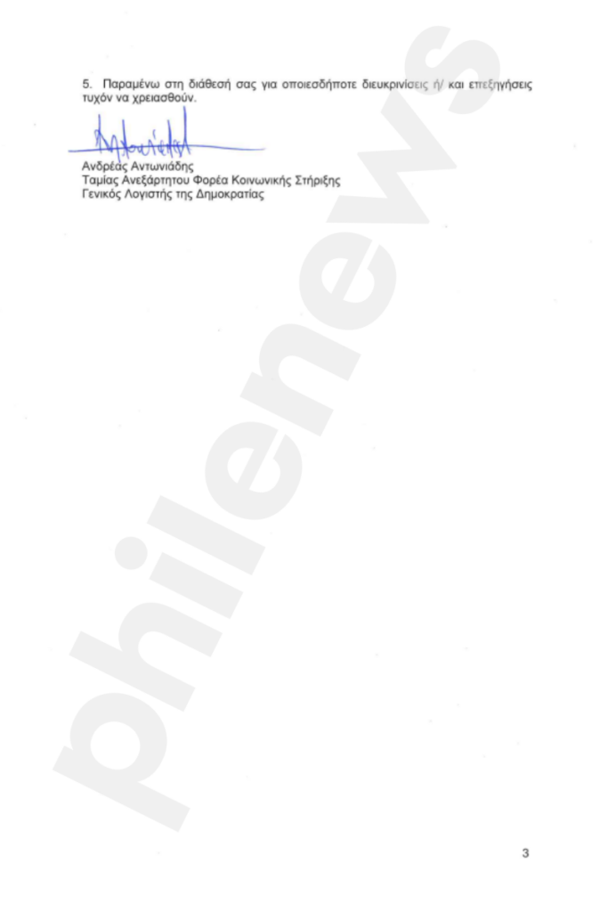 Ακόμα, ο κ. Αντωνιάδης προσθέτει πως αν η Επιτροπή επιθυμεί να υποβάλει εκ νέου σχετικό αίτημα, αυτό θα πρέπει να είναι «επαρκώς αιτιολογημένο», και να περιορίζεται στα «απολύτως αναγκαία δεδομένα».