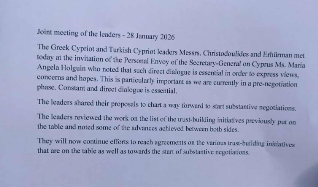 «Οι ηγέτες της ελληνοκυπριακής και της τουρκοκυπριακής κοινότητας, κ.κ. Χριστοδουλίδης και Ερχιουρμάν, συναντήθηκαν σήμερα κατόπιν πρόσκλησης της Προσωπικής Απεσταλμένης του Γενικού Γραμματέα του ΟΗΕ για την Κύπρο, κας Μαρία Άνχελα Χόλγκιν, η οποία τόνισε ότι ο άμεσος διάλογος είναι ουσιαστικής σημασίας για την έκφραση απόψεων, ανησυχιών και προσδοκιών. Αυτό είναι ιδιαίτερα σημαντικό, καθώς βρισκόμαστε αυτή τη στιγμή σε προ-διαπραγματευτική φάση. Ο συνεχής και άμεσος διάλογος είναι απαραίτητος.