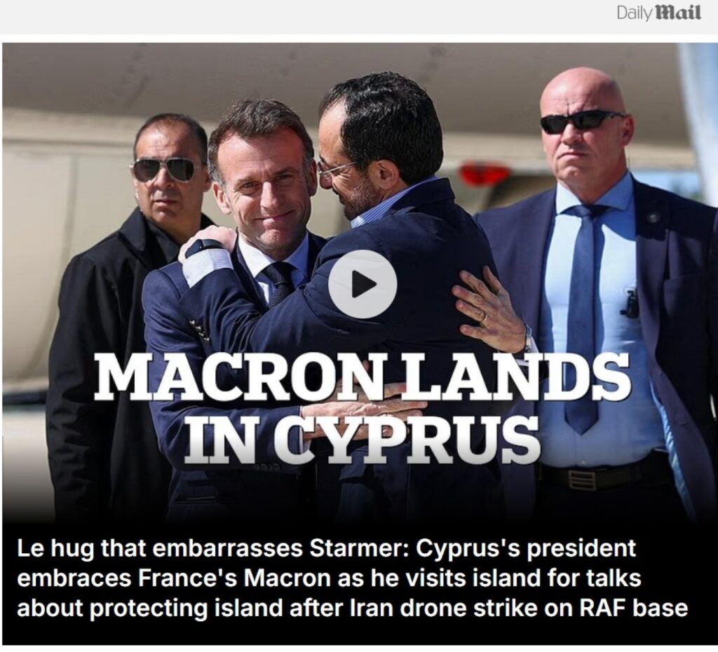 Με δηκτικό τρόπο υποδέχτηκε η Daily Mail την επίσκεψη του Εμανουέλ Μακρόν στην Κύπρο για να ανακοινώσει την ενίσχυση της γαλλικής στρατιωτικής παρουσίας στην Ανατολική Μεσόγειο, την ώρα που ο Κιρ Στάρμερ και το Βασιλικό Ναυτικό εξακολουθούν να παραμένουν στο Ηνωμένο Βασίλειο, παρά τις απειλές που αντιμετωπίζει συχνά πυκνά το νησί λόγω της βρετανικής αεροπορικής βάσης RAF στο Ακρωτήρι.