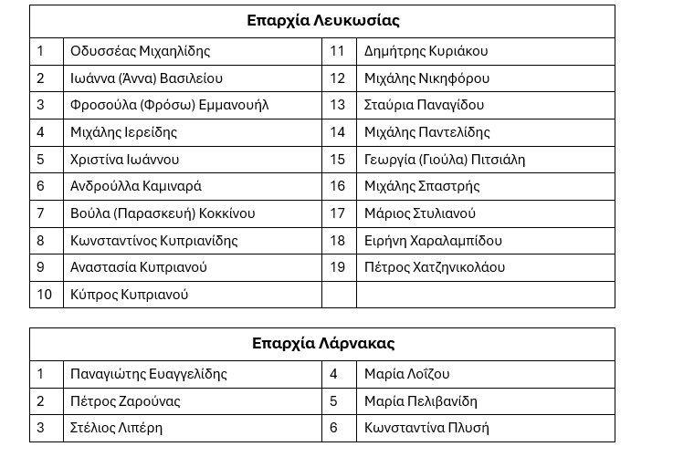 Με τις τρεις πιο πάνω υποψήφιες, συμπληρώνονται τα ψηφοδέλτια των επαρχιών Λευκωσίας και Λάρνακας τα οποία θα αποτελούνται από τους πιο κάτω: