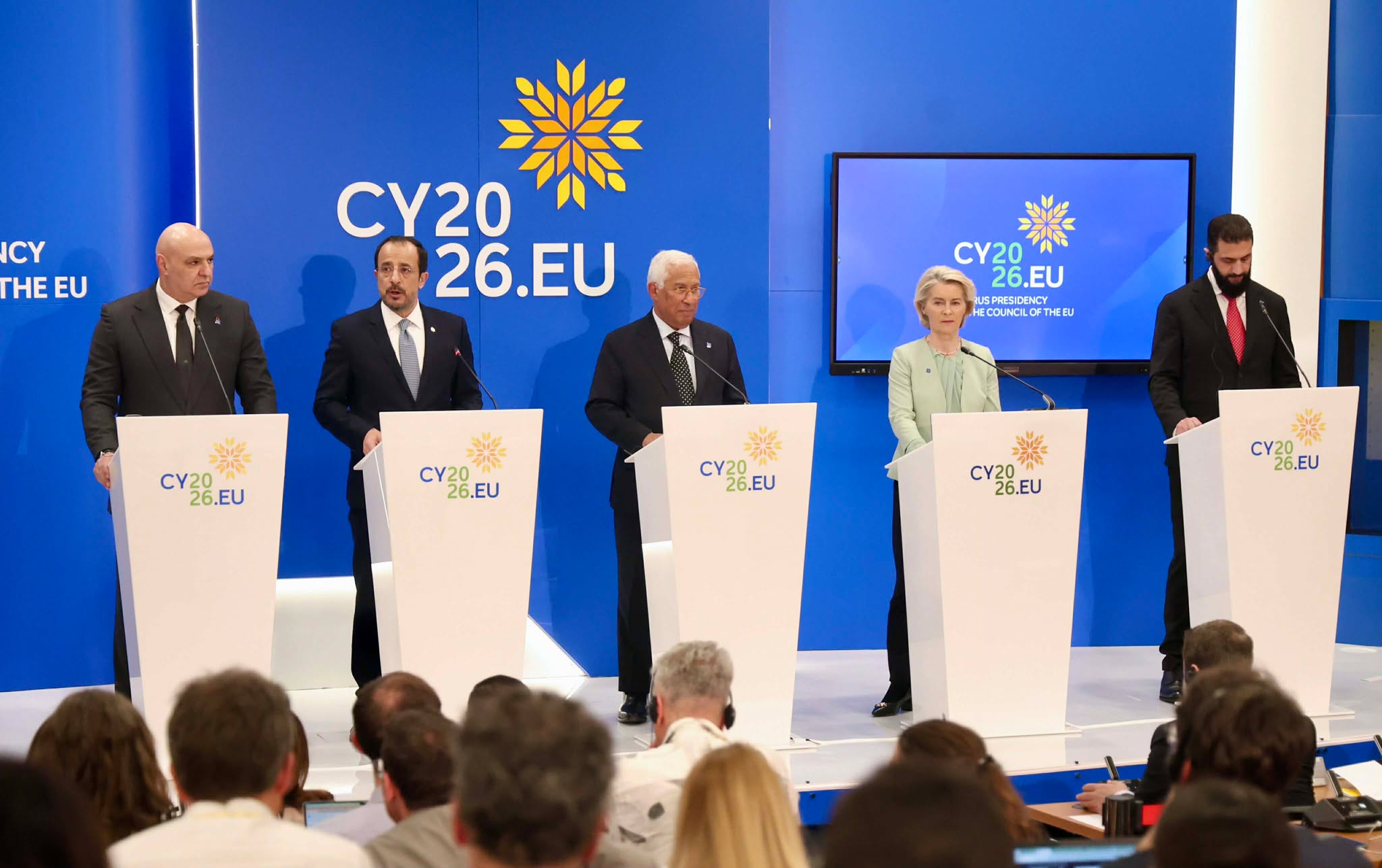 Στη διάσκεψη συμμετείχαν ο Πρόεδρος της Κυπριακής Δημοκρατίας, ο Πρόεδρος του Ευρωπαϊκού Συμβουλίου και η πρόεδρος της Κομισιόν. Νωρίτερα τοποθετήθηκαν από το βήμα ο Πρόεδρος του Λιβάνου Μισιέλ Αούν και ο ντς φάκτο ηγέτης της Συρίας, Αχμέντ Χουσεΐν αλ Σάρα.