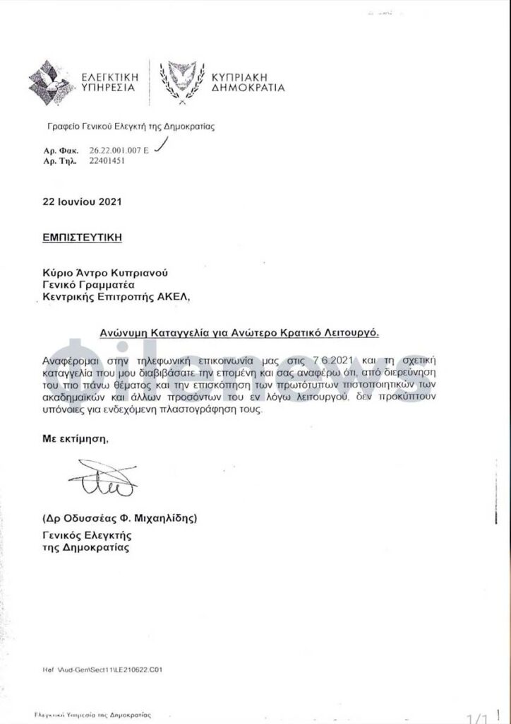 Αποκαλύπτουμε την απάντηση του Γενικού Ελεγκτή: «Αναφέρομαι στην τηλεφωνική επικοινωνία μας στις 7/6/2021 και τη σχετική καταγγελία που διαβιβάσατε την επομένη και σας αναφέρω ότι από τη διερεύνηση του πιο πάνω θέματος και την επισκόπηση των πρωτότυπων πιστοποιητικών των ακαδημαϊκών και άλλων προσόντων του εν λόγω λειτουργού, δεν προκύπτουν υπόνοιες για ενδεχόμενη πλαστογράφησή τους».