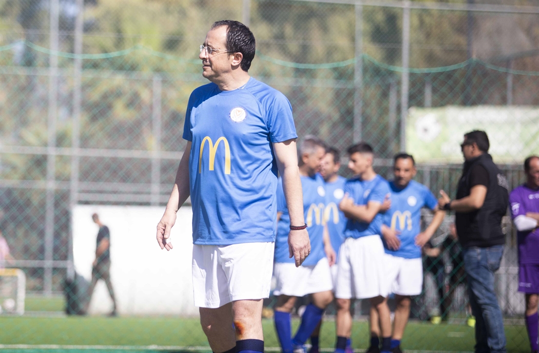 Με γαλάζια φανέλα, κοντό άσπρο παντελονάκι και παπούτσια ποδοσφαίρου, ο Πρόεδρος Χριστοδουλίδης ξεχύθηκε στο γήπεδο σε ένα αγώνα για φιλανθρωπικό σκοπό.