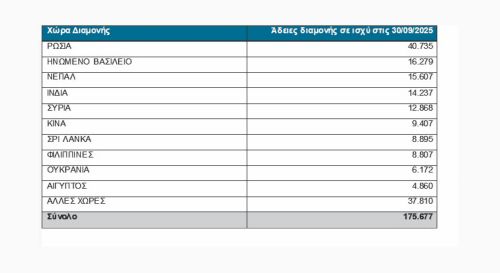 Στη γενική απασχόληση, οι πλείστοι εργαζόμενοι προέρχονται από το Νεπάλ με 4.805 άδειες και ακολουθούν Ινδοί με 3.955, Αιγύπτιοι με 3.551, Μπαγκλαντές 1.696, Σρι Λάνκα 1.550 και 2.700 από άλλες χώρες. Με άδειες διεθνούς προστασίας, την πρωτιά κατέχουν οι Σύροι αφού τέτοιο καθεστώς έχουν 11.340 πρόσωπα. Στην ίδια κατηγορία βρίσκονται οι Παλαιστίνιοι με 1.015 άδειες, άλλοι 787 Σομαλοί και 477 από το Καμερούν.
