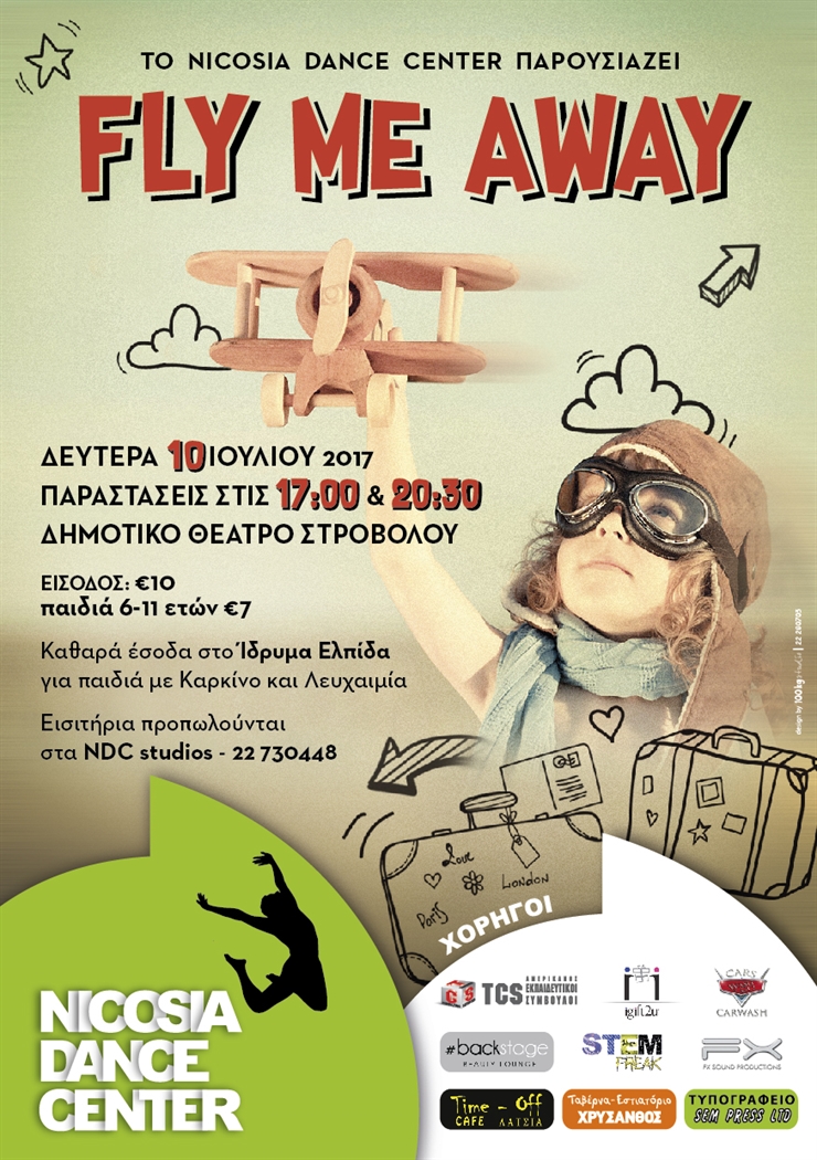 Τo Nicosia Dance Center παρουσιάζει την παραγωγή με τίτλο “Fly Me Away”, η οποία θα διεξαχθεί τη Δευτέρα 10 Ιουλίου 2017 στις 5:00-7:00μ.μ. και θα επαναληφθεί την ίδια μέρα στις 8:30-10:30μ.μ. στο Δημοτικό Θέατρο Στροβόλου. Χορός, μουσική και κωμικά θεατρικά συνθέτουν ένα ξεχωριστό αποτέλεσμα που προσφέρει μια αλλιώτικη αίσθηση ψυχαγωγίας.