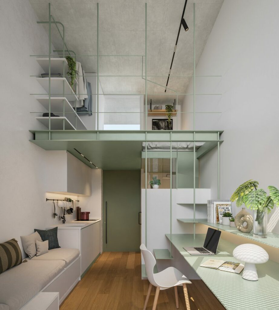 Η σκάλα που συνδέει τους δυο χώρους εκτός από την άνοδο, διαμορφώνει και το έπιπλο μελέτης. Με αυτή τη διάταξη, χωρίζεται σε δυο υπό-ενότητες, δίνοντας την ευκαιρία στον χρήστη να φτιάξει τον δικό του μικρόκοσμο, ανάλογα με τη χρήση. Το παράθυρο του παταριού πάνω από τον κοινόχρηστο διάδρομο, αφενός επιτυγχάνει τον διαμπερή αερισμό και αφετέρου παρέχει θέαση στους κοινόχρηστους χώρους των εστιών, πέρα από τη θέα προς την πόλη που παρέχει το μεγάλο υαλοστάσιο της βεράντας.