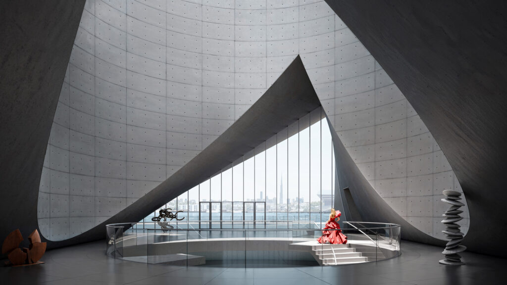 Στο εσωτερικό, η αφήγηση στην ιστορία του μαργαριταριού συνεχίζεται. Οι εκθεσιακοί χώροι περικλείονται από ένα κεντρικό αίθριο, το οποίο διοχετεύει ελεγχόμενο φως για να δημιουργήσει ένα στοχαστικό περιβάλλον. Το καμπύλο κέλυφος, που περικλείει μια κυκλική αίθουσα εκθέσεων, παραπέμπει στο σχήμα μαργαριταριού, όπως και ο κυλινδρικός φεγγίτης στο κέντρο του φιλτράρει το φως της ημέρας στις γκαλερί. Τριγωνικά ανοίγματα διακόπτουν τις λείες επιφάνειες, κωνικά προς τα πάνω για να φιλτράρουν το φως της ημέρας στους εσωτερικούς χώρους και να φωτίζουν τον επάνω όροφο, ο οποίος στεγάζει ένα σαλόνι και ένα εστιατόριο.