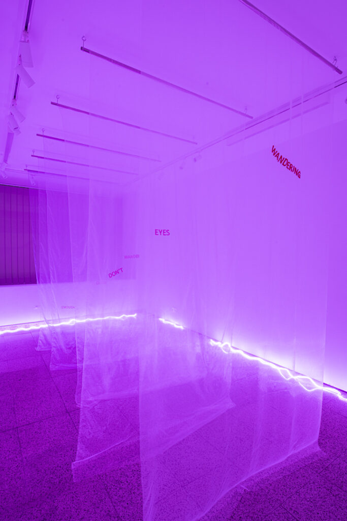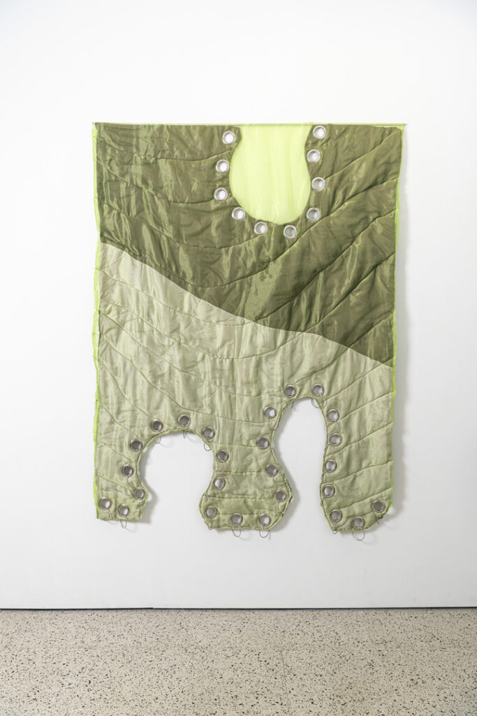 -Στις εγκαταστάσεις σου χρησιμοποιείς συχνά υφάσματα και κεντήματα. Τι σε ελκύει στο χειροποίητο; Αν και εκπαιδεύτηκα ως ζωγράφος, σκέφτομαι με όρους γλυπτικής και πάντα με ενδιέφερε τα υλικά μου να εκτείνονται στον χώρο. Το ύφασμα με μάγευε από μικρή. Θυμάμαι, στο Λαογραφικό Μουσείο Λεμεσού, να εντυπωσιάζομαι από τα κεντήματα, και παρακολουθώντας τη γιαγιά μου να κεντάει ένιωθα τον ίδιο ενθουσιασμό. Με γοητεύει η διαδικασία τού να φτιάχνεις κάτι από το μηδέν με ένα νήμα και τόση λεπτομέρεια. Οι ίνες και τα υφάσματα, βαθιά ριζωμένα στην κυπριακή κουλτούρα, αποτελούν για μένα έναν τρόπο να διατηρώ ζωντανή την παράδοση, προσαρμόζοντάς την στους δικούς μου όρους με σύγχρονη γλώσσα.