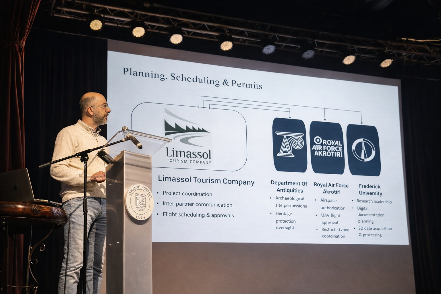 Ο αρχιτέκτονας μηχανικός και ειδικός σε θέματα τηλεπισκόπησης Αργύρης Φελλάς, παρουσίασε την καινοτόμο μεθοδολογία ψηφιακής αποτύπωσης που εφαρμόστηκε με χρήση εξειδικευμένου εξοπλισμού του Πανεπιστημίου Frederick για τη δημιουργία του Τρισδιάστατου Μοντέλου του Ιερού.