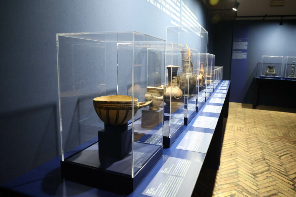 Ανάμεσα στα εκθέματα ξεχωρίζει ένα εντυπωσιακό τάλαντο χαλκού σε σχήμα δοράς βοδιού από την περιοχή Serra Ilixi στη Σαρδηνία, φτιαγμένο από κυπριακό χαλκό, που διένυσε πάνω από δύο χιλιάδες χιλιόμετρα για να φθάσει από την Κύπρο στην Σαρδηνία και χρονολογείται περίπου στο 1500–1200 π.Χ. Το αντικείμενο αυτό αναδεικνύει την έκταση του εμπορίου και της τεχνολογικής ανταλλαγής της Εποχής του Χαλκού, υπογραμμίζοντας τη διασύνδεση των μεσογειακών κοινωνιών και ιδιαίτερα της Κύπρου με την Ιταλία.