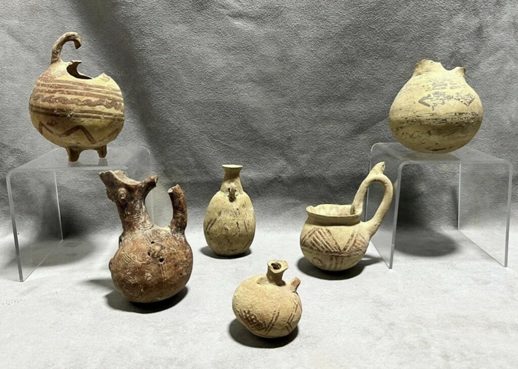 Πρόκειται για δύο αγγεία της Πρώιμης Εποχής του Χαλκού (2500-1900 π.Χ.), 11 αγγεία της Μέσης Εποχής του Χαλκού (1900-1600 π.Χ.), τρία αγγεία της Κυπρο-Αρχαϊκής Ι περιόδου (750-600 π.Χ.), ένα αγγείο της Κυπρο-Αρχαϊκής ΙΙ περιόδου (600-480 π.Χ.) και ένα ασβεστολιθικό κεφάλι αντρικού αγάλματος του 4ου αιώνα π.Χ.
