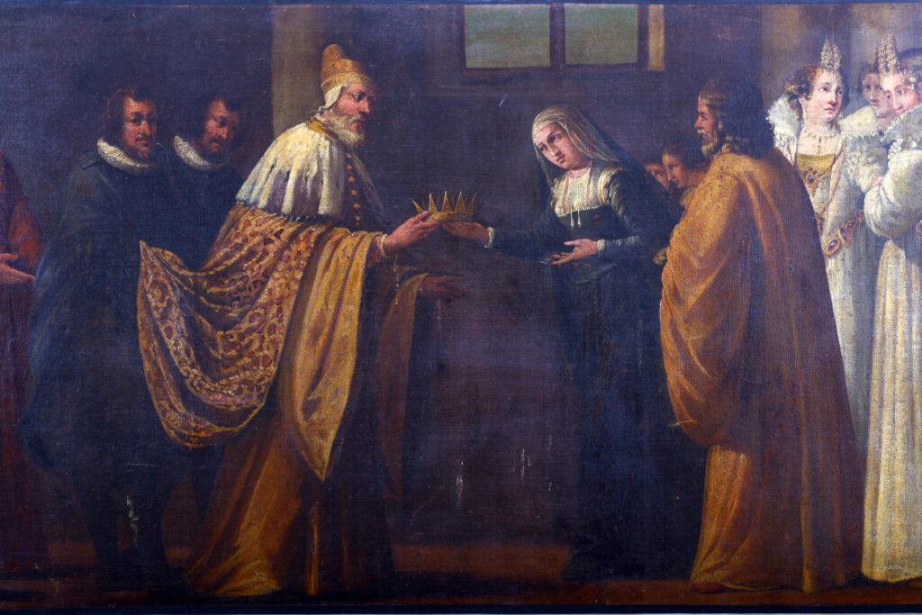 -Τα έργα αποκαλύπτουν πληροφορίες που αφορούν την ιστορία και την πολιτική της περιόδου κατά την οποία η Κορνάρο ήταν βασίλισσα στην Κύπρο; Πράγματι, τα έργα αποκαλύπτουν σημαντικές πτυχές της πολιτικής συγκυρίας. Ιδιαίτερα το πρώτο έργο, το οποίο απεικονίζει μια σκηνή ακρόασης στην κυπριακή Αυλή της, παρουσιάζοντας την Αικατερίνη όχι στα πρόθυρα της παραίτησης αλλά ως ενεργή ηγεμόνα. Το επεισόδιο παραπέμπει στον Νοέμβριο του 1473, όταν ο Βενετός αξιωματούχος Pietro Mocenigo κατέστειλε συνωμοσία εναντίον της. Η Αικατερίνη εικονίζεται υπερυψωμένη σε βαθμιδωτό βάθρο, κάτω από παραπέτασμα που λειτουργεί ως σύμβολο κρατικής εξουσίας. Δίπλα της στέκεται ο αδελφός της, Zorzi, υποδηλώνοντας τη στενή σύνδεση οικογένειας και εξουσίας, ενώ μπροστά της ο Mocenigo, σε στάση σεβασμού, οριοθετεί τη σχέση ηγεμόνα και υπηκόου. Η αποκλειστικά ανδρική σύνθεση, με τη βασίλισσα ως μοναδική γυναικεία παρουσία, ενισχύει την εικόνα της ως κυρίαρχης μορφής.