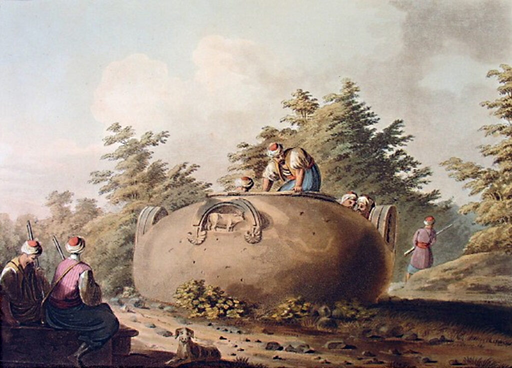 Ένα «αριστούργημα αρχαϊκής τέχνης» το χαρακτήρισε ο κόμης Melchior de Vogüé, επικεφαλής της γαλλικής αρχαιολογικής αποστολής στην Κύπρο μεταξύ 1862 και 1865. Αυτό το ογκώδες μονολιθικό αγγείο από ασβεστόλιθο, με διάμετρο πέραν των 3 μ., ύψος σχεδόν 2 μ. και βάρος περίπου 13 τόνων, παρουσιάζει ιδιαίτερο ενδιαφέρον από τελετουργική και επιγραφική άποψη. Τοποθετημένο στον αύλειο χώρο του ιερού, το αγγείο αυτό δεν ήταν μόνο του· ένα δεύτερο αγγείο, εξίσου μνημειακό, αν όχι μεγαλύτερο, όπως μαρτυρείται σε περιηγητικά κείμενα του 16ου αιώνα, είχε φθαρεί με την πάροδο του χρόνου. Ο Edmond Duthoit, αρχιτέκτονας της αποστολής του Vogüé, φιλοτέχνησε σχέδια που απεικονίζουν τα δύο αγγεία επιτόπου, ενώ αρκετοί περιηγητές τα απεικόνισαν τοποθετημένα στην κορυφή της ακρόπολης της Αμαθούντας.