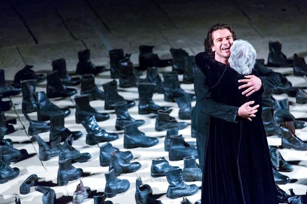Αντί σκηνικού, δέσποζε στο κέντρο της σκηνής μια εικαστική εγκατάσταση σε σχήμα τέλειου κύκλου, με τακτικώς τοποθετημένες δερμάτινες στρατιωτικές αρβύλες, μια έμπνευση- φόρος τιμής του σκηνοθέτη στον εκλιπόντα συνεργάτη και το αβίαστα προκλητικό πνεύμα της Arte Povera. Την ώρα που η δράση διαρρηγνύει την τάξη εντός του κύκλου (ο εφιάλτης του ιδεοψυχαναγκαστικού) ο αποδέκτης τακτοποιεί στο μυαλό του σκέψεις, μνήμες, συνειρμούς, ενώνει κομμάτια που προκύπτουν σαν αποτέλεσμα φυσικών εξισώσεων και οδηγούν στην αλήθεια και την κάθαρση. Η διαίρεση της Κασσάνδρας, ως ηχώ ενός κατακερματισμένου κόσμου, ανέδειξε την οικουμενικότητα κάθε ιδιωτικού θρήνου και τη διορατικότητα του κλασικού ποιητικού λόγου με τη διαχρονική αντιπολεμική της δυναμική.