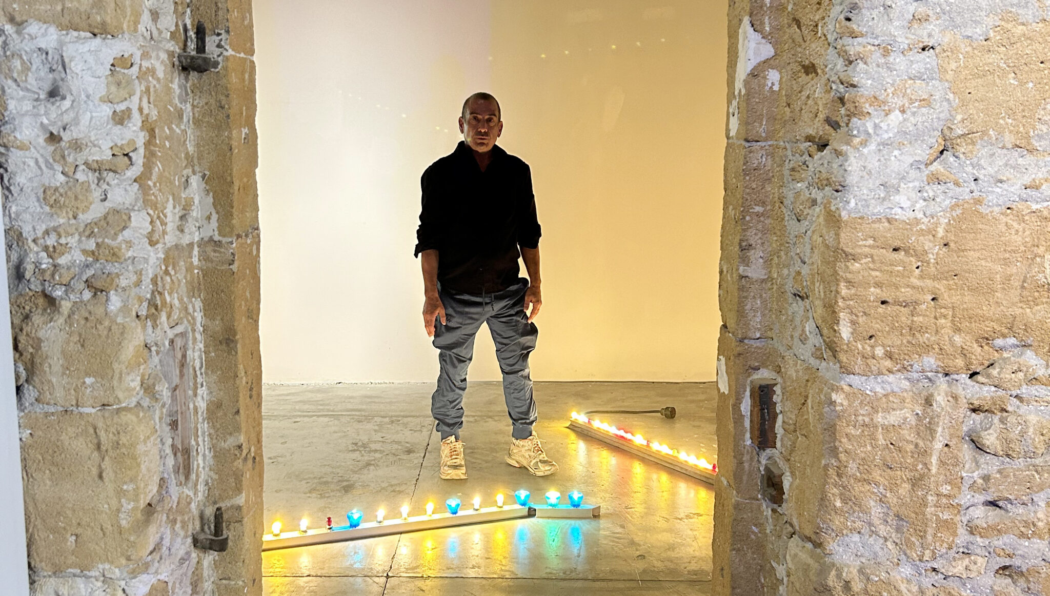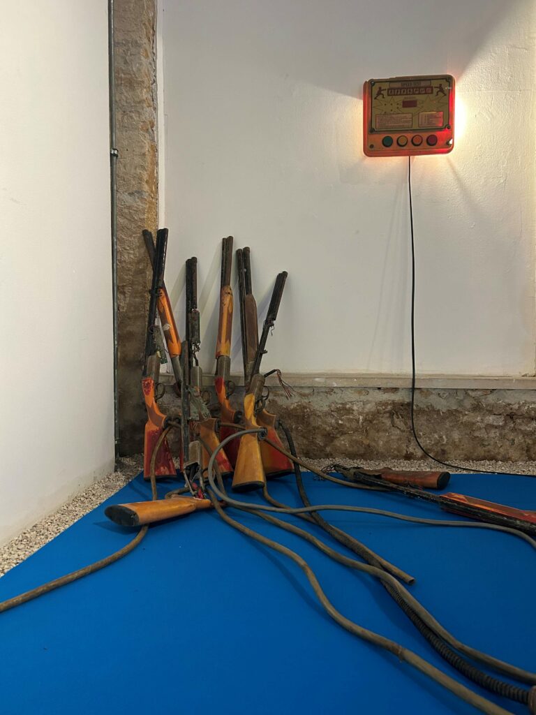 Τα τραχιά υλικά που χρησιμοποιεί στα έργα του, αυτή τη φορά τα επιλεγμένα από τον ίδιο παιχνίδια του Tivoli, έχουν τοποθετηθεί επάνω σε μια γαλάζια μοκέτα που καλύπτει, τον ιδανικό για το έργο του, χώρο του ΝiMAC. Με αυτό τον τρόπο καταφέρνει να δώσει στον θεατή μια αντιφατική βιωματική εμπειρία: την αίσθηση της μαλακότητας και της βαρβαρότητας, ταυτόχρονα. Γιατί γαλάζιο; «Γιατί είναι το πρώτο χρώμα που έρχεται στο μυαλό του όταν σκέφτεται την Κύπρο. «Μαζί με το φωτεινό κίτρινο», θα συμπληρώσει.