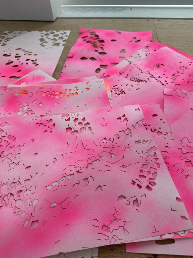 -Ποια είναι τα χαρακτηριστικά και η φιλοσοφία των έργων που παρουσιάζετε; Έκοψα και χάραξα τα αφηρημένα μοτίβα υφής μωσαϊκού σε πάνω από 60 κομμάτια χαρτιού. Αυτά θα τοποθετηθούν απευθείας σε ένα παράθυρο, σε μια κεντρική πλατεία της πόλης. Το κομμένο χαρτί επιτρέπει στο φως να περάσει, φιλτράροντάς το και δημιουργώντας σκιές μέσα και έξω. Το χαρτί είναι τυπωμένο και βαμμένο σε ροζ τόνο, ώστε να αναπαριστά τη ζεστασιά των πλακιδίων μωσαϊκού που εξερεύνησα. Θεωρώ ότι κάθε κομμάτι με ξεχωριστή εκτύπωση έχει μια διαφορετική ιστορία να διηγηθεί. Με αυτό το έργο ελπίζω οι θεατές να απολαύσουν μια νέα ματιά σε ένα ιστορικό τοπίο και να επισκεφθούν το έργο περισσότερες από μία φορές. Καθώς το φως διαπερνά το έργο, αυτό αλλάζει κατά τη διάρκεια της ημέρας. Το έργο ονομάζεται «Luminous Geometry» (Φωτεινή Γεωμετρία) και αναφέρεται στο πέρασμα του φωτός μέσα από το χαρτί, καθώς και στα ψηφιδωτά πλακάκια και την εγκατάσταση εκτύπωσης ως ένα είδος χαλαρού πλέγματος.