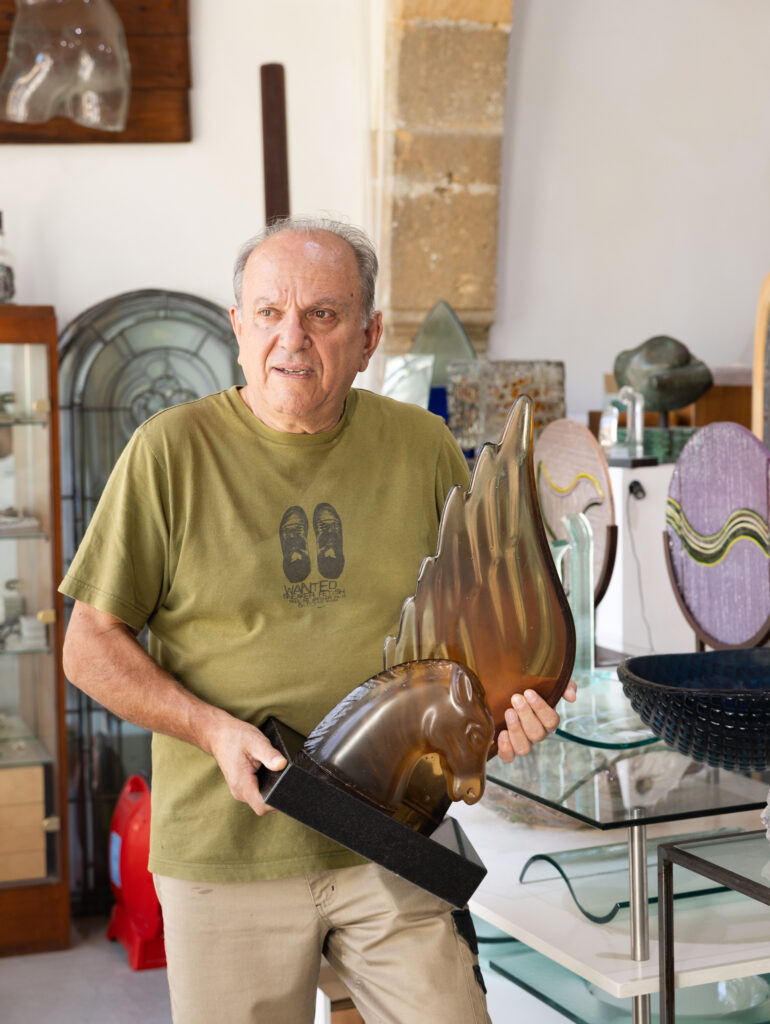 Πώς επέλεξε ως βασικό υλικό της δουλειάς του το γυαλί; « Ήθελα πάντα να κάνω κάτι που δεν υπήρχε στην Κύπρο. Έργα με γυαλί ήταν σχεδόν ανύπαρκτα τη δεκαετία του ’80. Τα τελευταία 40 χρόνια πειραματίζομαι συνέχεια στο εργαστήρι μου με νέες τεχνικές. Άρχισα από τη χάραξη στο γυαλί. Καθ’ οδόν, ανακάλυψα ότι υπάρχουν πολύ περισσότερα που έπρεπε να τα μάθω. Μετά άρχισα να κάνω γυαλί μερικής στίξης. Σ’ αυτό με βοήθησε πολύ ο μακαρίτης κεραμίστας Αριστοφάνης, ο οποίος μου επέτρεψε να πειραματίζομαι στους φούρνους του με το glass fusing. Μετά συνέχισα με το παραδοσιακό βιτρό, όπως γινόταν τον 10ο αιώνα, με φυσητό γυαλί και μόλυβδο. Έπειτα συνέχισα με το βιτρό σε συνδυασμό με μπετόν ή ρεζίνα, μια τεχνική που εμφανίστηκε στη Γαλλία και έχει σχέση με το χυτό γυαλί. Ένα μεγάλο κομμάτι της δουλειάς μου είναι το βιτρό, όμως σήμερα φθίνει λόγω ψηλού κόστους».