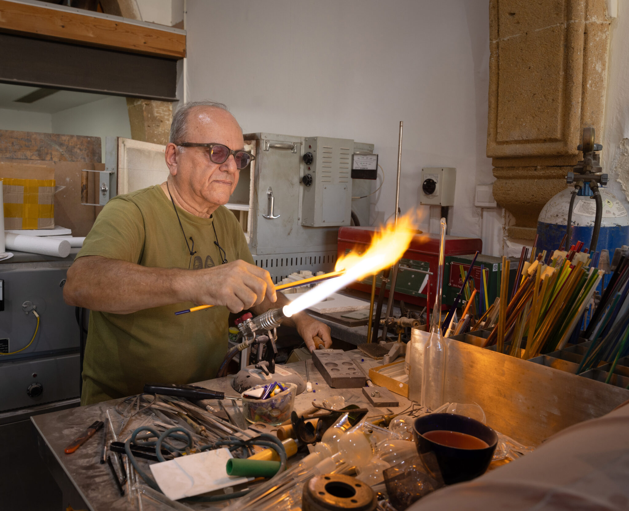 Πώς επέλεξε ως βασικό υλικό της δουλειάς του το γυαλί; « Ήθελα πάντα να κάνω κάτι που δεν υπήρχε στην Κύπρο. Έργα με γυαλί ήταν σχεδόν ανύπαρκτα τη δεκαετία του ’80. Τα τελευταία 40 χρόνια πειραματίζομαι συνέχεια στο εργαστήρι μου με νέες τεχνικές. Άρχισα από τη χάραξη στο γυαλί. Καθ’ οδόν, ανακάλυψα ότι υπάρχουν πολύ περισσότερα που έπρεπε να τα μάθω. Μετά άρχισα να κάνω γυαλί μερικής στίξης. Σ’ αυτό με βοήθησε πολύ ο μακαρίτης κεραμίστας Αριστοφάνης, ο οποίος μου επέτρεψε να πειραματίζομαι στους φούρνους του με το glass fusing. Μετά συνέχισα με το παραδοσιακό βιτρό, όπως γινόταν τον 10ο αιώνα, με φυσητό γυαλί και μόλυβδο. Έπειτα συνέχισα με το βιτρό σε συνδυασμό με μπετόν ή ρεζίνα, μια τεχνική που εμφανίστηκε στη Γαλλία και έχει σχέση με το χυτό γυαλί. Ένα μεγάλο κομμάτι της δουλειάς μου είναι το βιτρό, όμως σήμερα φθίνει λόγω ψηλού κόστους».