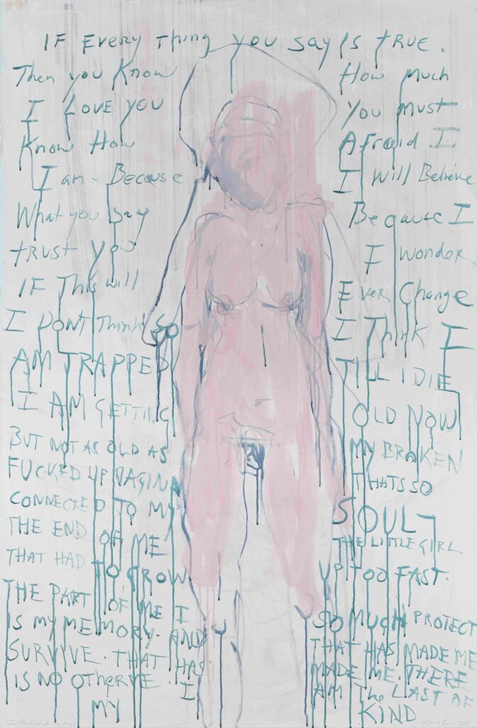 –Η εμπειρία της Emin με τον καρκίνο, τις χειρουργικές επεμβάσεις και την αναπηρία αντιμετωπίζεται άμεσα στην έκθεση, τονίζοντας την άρνησή της να διαχωρίζει το προσωπικό από το δημόσιο. Πώς συνεργαστήκατε με την Έμιν για τη διαμόρφωση της έκθεσης; Η Έμιν έχει μιλήσει ανοιχτά για τον καρκίνο της και την πραγματικότητα της ζωής με σακούλα στομίας. Έχει προσφέρει σημαντική υποστήριξη σε φιλανθρωπικούς οργανισμούς, τόσο τοπικά όσο και διεθνώς. Στην καλλιτεχνική της δημιουργία, μπορεί κανείς να δει ότι οι γυναικείες μορφές στα έργα της παλαιότερα φορούσαν ψηλοτάκουνα, παραπατούσαν, φώναζαν ή ήταν ξαπλωμένες στο πάτωμα ενός μπάνιου, όπως στο Keep your Darkness Away (2011). Είχαν μια έντονα βασανισμένη φόρτιση, συχνά με υπαινιγμούς κακοποίησης. Είναι συγκλονιστικά και σπαρακτικά έργα, με την αμφισημία να αφήνει τον θεατή να συμπληρώσει τα κενά. Όταν η Έμιν επέστρεψε στη ζωγραφική — είναι πρωτίστως ζωγράφος, όπως αποδεικνύει αυτή η έκθεση — οι πίνακές της εξακολουθούν να ξεχειλίζουν από συναίσθημα, ίσως όμως πιο στοχαστικοί ή πνευματικοί, όπως στο I Watched Myself Die and Come Alive (2023) ή στο Your Beautiful Soul (2024), που παρουσιάζονται στην τελευταία αίθουσα.